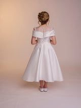 Made from a luxurious silk blend mikado fabric the Penny dress features a bardot like neckline over its sheer organza top and shoulders. The off the shoulder detail is adorned with satin flowers, concentrated on the right side of the dress and fading towards the left. The bodice of this dress features seams in a V formation that meet the waistline before its full circle skirt begins that is complete with pockets. Penny is then finished with matching buttons on the back and a matching belt to complete the look.