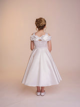 The Molly dress is a fully supreme satin style. With its full circle skirt and high scoop neck this dress is the definition of fun. Four bows cover the top of the dress in a circular fashion, starting at the front and looping around to the back. The bows at either side of the dress act as a sort of sleeve, providing a bit of coverage. Complete with a matching belt, the Beau dress also features pockets.