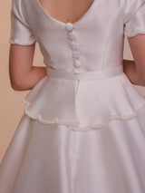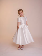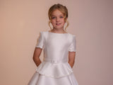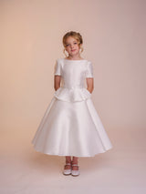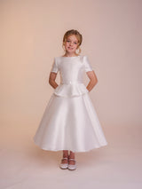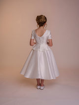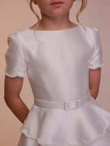 The Freya dress may look familiar to you. A Shauna fay classic reimagined and redesigned for communion wear. Made from a fabulous white silk blend mikado, the Freya dress features the most beautiful peplum skirt complete with a stunning hand stitched beaded scalloped edge. The peplum sits above a fabulous full circle skirt and is complete with a matching belt to finish the look. The bodice features a high boat neckline with sleeves that mimic the peplum skirt with their beaded scallop trim. The back features a soft v neckline and is finished with matching buttons that meet the belt
