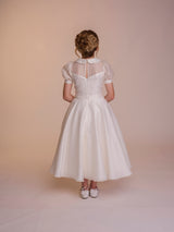 The Maisie dress features a peter pan collar that sits on top of a beautiful ivory polka dot sheer silk organza neckline with matching puff sleeves with a cuff to finish. Covered buttons run down the centre seam of the bodice. The polka dot printed silk organza covers the full dress, giving the dress a soft all over pattern. A full circle skirt features pockets and the look is completed with a matching belt.