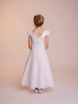 The Poppy dress features a softer skirt and beautiful boat neckline. Both sides of the skirts are covered in gorgeous corded lace panels that create an almost basque effect on the luxury crepe skirt, complete with cap sleeve, finished with a matching lace trim. The back of the dress features a v back complete with buttons running down the back seam until they meet the lace.