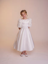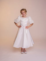 The Rosie dress is all about the sleeves. Featuring beautiful oversized floral textured sleeves, this dress will be sure to turn heads. With a full supreme satin skirt and bodice, the Rosie dress is completed with a matching belt. The back of the dress features a long modern bow at the base of a row of matching fabric covered buttons.