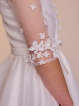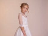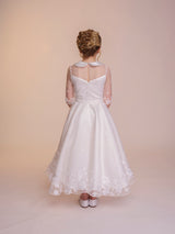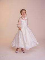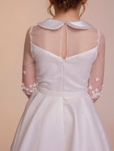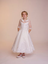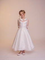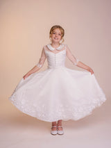 The Arabella dress features a beautiful full circle skirt with an all over silk organza layer that follows throughout the full design. The base of the skirt is adorned with individual satin flowers; the same flowers adorn the base of the sheer silk organza ¾ length sleeves. A peter pan collar sits on top of the sheer organza neckline meeting it’s pointed bodice that is finished with a row of satin covered buttons running down the centre seam. Complete with a matching belt.