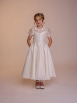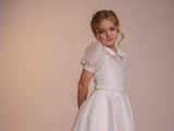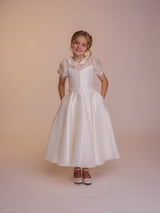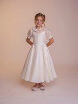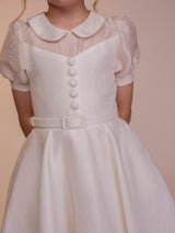 The Maisie dress features a peter pan collar that sits on top of a beautiful ivory polka dot sheer silk organza neckline with matching puff sleeves with a cuff to finish. Covered buttons run down the centre seam of the bodice. The polka dot printed silk organza covers the full dress, giving the dress a soft all over pattern. A full circle skirt features pockets and the look is completed with a matching belt.